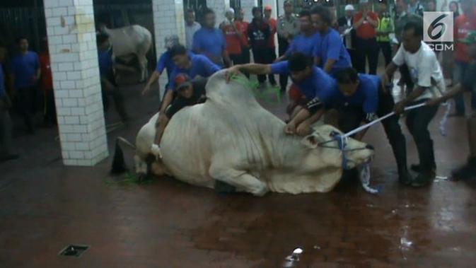 Liputan6.com, Jakarta Panitia pemotongan hewan kurban Masjid Istiqlal mulai menyembelih hewan kurban di rumah potong hewan Masjid Istiqlal, Jakarta Pusat, pada Rabu malam.