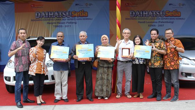 Liputan6.com, Palembang - PT Astra Daihatsu Motor (ADM) kembali memberikan kejutan bagi pelanggannya melalui Daihatsu Setia 2018. Total, sebanyak 45 unit yang terdiri dari 20 unit Xenia, 20 unit Terios, 3 unit Luxio, dan 2 unit Sirion milik konsumen yang direkondisi menjadi seperti baru keluar dari pabrik.