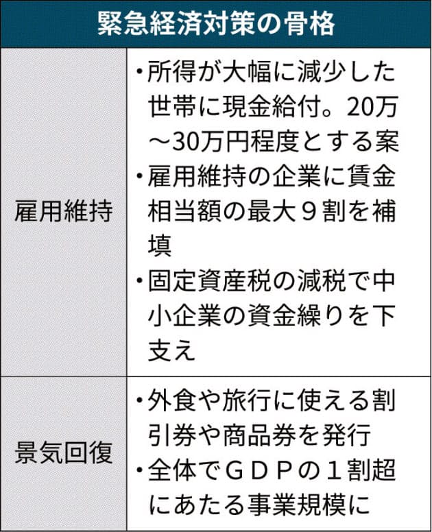政府は新型コロナウイルスの感染拡大を受けた緊急経済対策で、5月にも所得が大幅に減少した世帯に現金を給付する検討に入った。条件が当てはまる1世帯に20万~30万円程度とする案がある。売り上げの急減が予想される飲食業や観光業は割引券や商品券を発行して支える。経済対策の事業規模(総合2面きょうのことば)は名目国内総生産(GDP)の1割にあたる56兆円超をめざす。