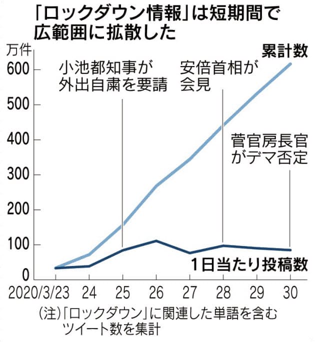 「4月1日から東京がロックダウン(都市封鎖)される」――。3月下旬からSNS(交流サイト)上で、新型コロナウイルスに関する偽ニュースがまことしやかに拡散した。出所も真偽も不明なまま、爆発的に広がる例が多く、実体経済に混乱をもたらすケースも出始めている。情報共有を容易にする便利なSNSだが、使い方次第で社会の不安を増幅する要因にもなりかねない。