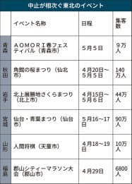 山形県では武将にふんした人が駒代わりに動く天童市の「人間将棋」(4月18~19日)や、毎年30万人前後が訪れる米沢市の「米沢上杉まつり」(4月29日~5月3日)など著名な祭りの中止や延期が相次ぎ決まった。福島県郡山市で4月29日に予定されていた郡山シティーマラソン大会も中止。すでに応募が締め切られ、約7500人の参加が決まっていた。今年で27回目となる人気イベントで中止は11年の東日本大震災の直後以来だ。