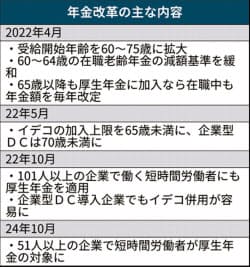 公的年金は現在、受給開始年齢を60~70歳としているが、2022年4月以降は60~75歳に広げる。75歳から受け取ると、基準である65歳開始と比べ毎月の年金額が84%増える。働く高齢者の厚生年金を減らす「在職老齢年金」は減額の対象となる人を減らす。