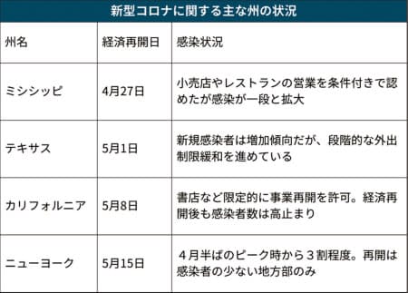 たとえばテキサス州は経済を再開した5月に入ってから感染者がさらに増え、累計感染者は5万人に迫っている。アリゾナ州も5月以降に、新規感染がピークとなった。経済再開が感染拡大につながっている可能性もある。