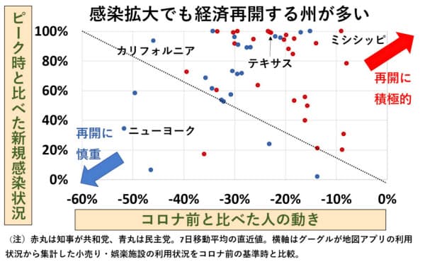 グラフは州ごとの感染動向と経済再開の状況をまとめたものだ。グラフの右上に多くの州があるように、感染状況がピークに近いにもかかわらず、経済活動を再開した例が目立つ。