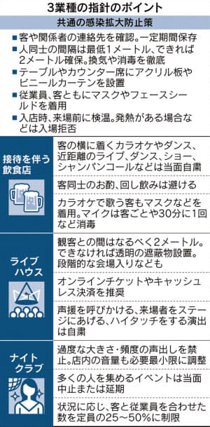 西村康稔経済財政・再生相が13日に公表した指針はキャバレーやホストクラブ、スナックなど接待を伴う飲食店のほか、ナイトクラブとライブハウスの3業種を対象とする。3業種すべてに客や関係者の連絡先の確認や人同士でなるべく2メートル、最低1メートルの間隔を確保するなどの対策を求めた。