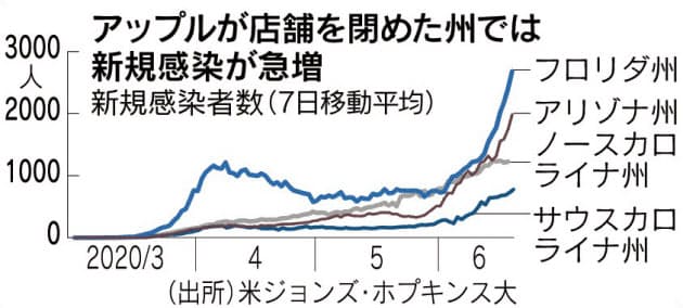 【ニューヨーク=中山修志】経済再開が進む米国で、新型コロナウイルス感染の第2波のリスクが浮上している。米アップルは営業を再開したフロリダ州などの一部店舗を再び閉鎖する。自動車工場でも従業員の感染により操業を止める事例が出ている。経済再開で先行した南部州を中心に患者数が拡大に転じており、企業が対応を迫られそうだ。