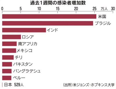 同大が集計対象とする188カ国・地域のうち、過去1週間の感染者数の増加数が最も多かったのは米国の25万人超で、ブラジル(24万人超)、インド(約11万人)が続いた。過去1週間以内に1日あたり新規感染者数が最多を更新したのは中南米などを中心に60カ国に達する。