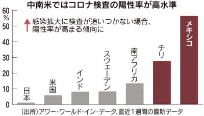 英オックスフォード大学の研究者らのデータベース「アワー・ワールド・イン・データ」によると、メキシコは検査の陽性率が5割超と、世界で突出する。メキシコ国立自治大学は国内感染者数が10月までに現在の12倍の259万人に達する可能性があると指摘した。