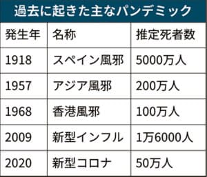 世界の累計死者数も28日、約50万人となった。約5000万人だったスペイン風邪など代表的なパンデミック(世界的な大流行)と比べるとまだ少ない。ただ、2002~03年にアジア中心に広がった重症急性呼吸器症候群(SARS)や、12年以降に中東などを襲った中東呼吸器症候群(MERS)と比べると被害は大きい。WHOによると関連死者はSARSが813人、MERSが858人だった。(黄田和宏、千葉大史)