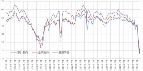 DIは、50であれば横ばい、それ以上なら景気は上向き、それ以下なら景気は下向きと、ざっくり判断できます。家計動向関連、企業動向関連、雇用関連それぞれ以下のように推移していました。