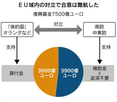 欧州連合(EU)の首脳会議は21日、コロナ禍からの経済再生を図るため、7500億ユーロ(約92兆円)の復興基金を創設することで合意した。EUが借金して加盟国に配分する仕組みで、悲願だった財政統合に向けた一歩といえる。英国の離脱で逆回転した欧州統合はコロナ禍という危機がバネとなり、遠心力に歯止めがかかった。