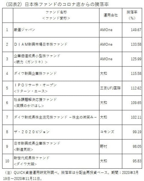 コロナショックで日経平均株価が底値を付けた3月19日から11月11日までの国内株式型ファンドの騰落率ランキングをみると、1位は「厳選ジャパン」の149.67%、2位は「DIAM新興市場日本株ファンド」の133.58%、3位は「企業価値成長小型株ファンド<愛称:眼力(ガンリキ)>」の125.99%になった。この間の日経平均株価の上昇率の約53%と比較すると、値上がり幅の大きさが分かる。東証マザーズ指数が10月半ばに14年2カ月ぶりの高値を付けるなど、これらのファンドが組み入れている小型株の値上がりが運用成績にプラスに寄与した。
