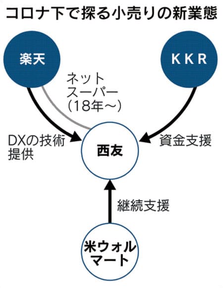KKRは世界の小売業への投資で蓄積したノウハウを提供する。楽天は小売業のDX推進を支援する子会社を21年1月に設立し、同社を通じて西友に出資する。電子商取引(EC)などで西友と協力する。