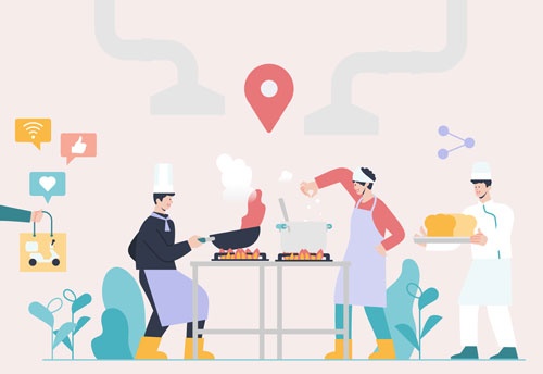 シェアリングエコノミーの裾野は広がり、ゴーストキッチンもその一種。また、カメラやバッグ、子ども用玩具など趣味嗜好品のジャンルも開拓されつつある(イラスト:PIXTA)